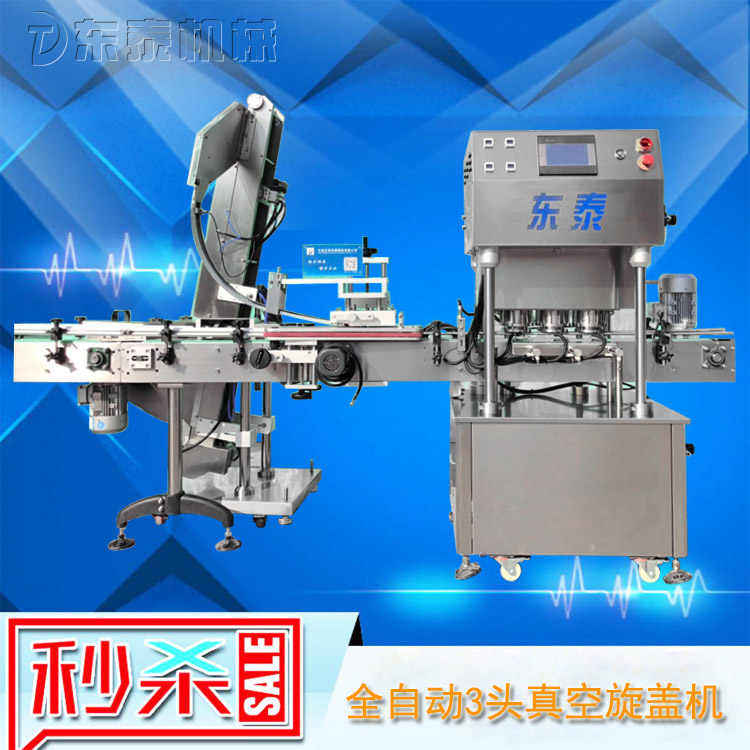該直線式真空旋蓋機是東泰機械結合用戶使用的情況,摒棄了傳統(tǒng)轉盤式真空旋蓋機的弊端,研制開發(fā)的新型高效設備,設備自動檢測到兩個瓶子蓋子進入到雙頭真空旋蓋機內,旋蓋機彩色顯示屏會實時顯現旋蓋狀況,整機多點檢測,當進口無瓶無蓋、出口堵塞、定位不準、瓶身傾倒均自動停機。單個旋蓋頭達到的真空度都可以單顯示,單調整