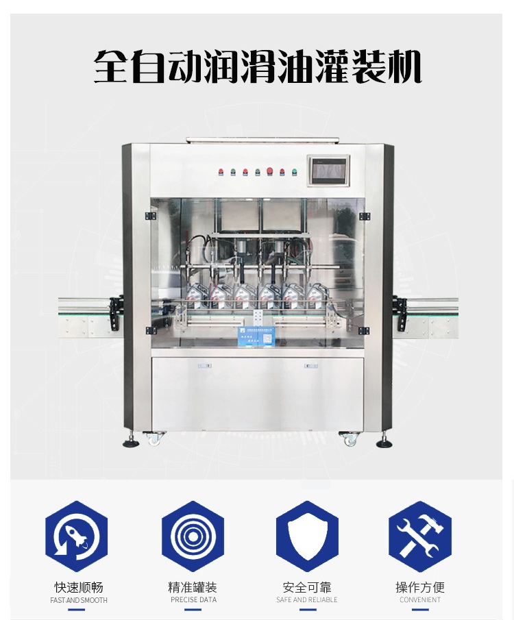 該六頭柱塞式全自動潤滑油灌裝機(jī)獨(dú)特的灌裝頭設(shè)計及真空回吸系統(tǒng),確保灌裝過程無殘油滴漏,快慢雙速灌裝,灌裝速度可調(diào),杜絕溢瓶現(xiàn)象。