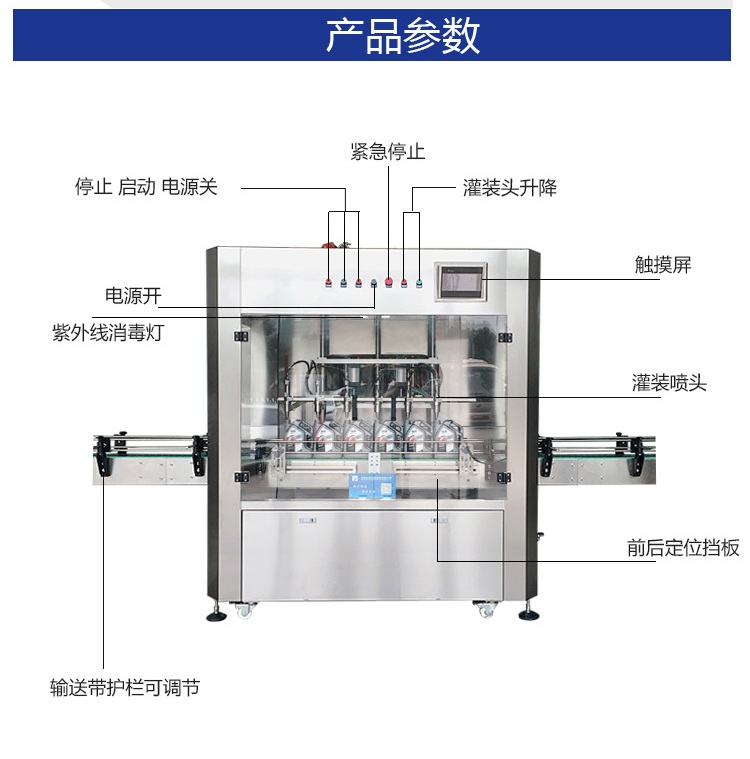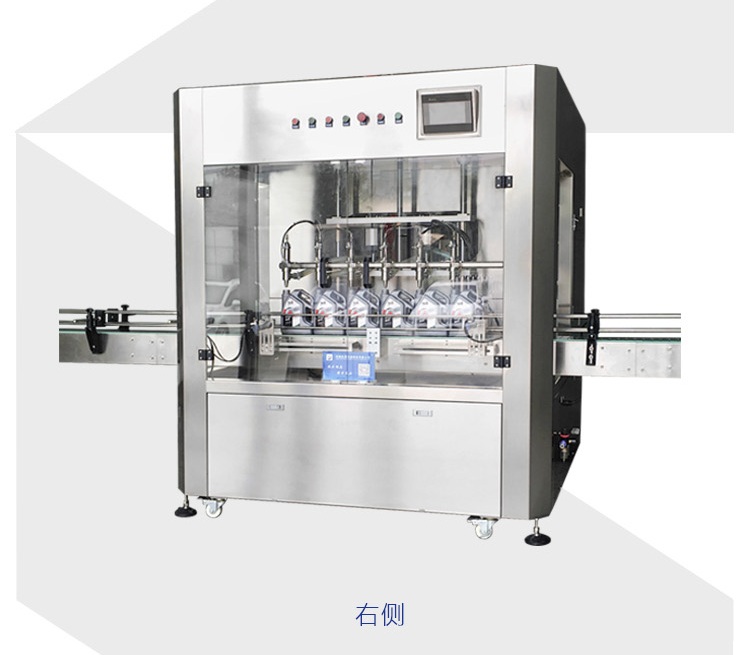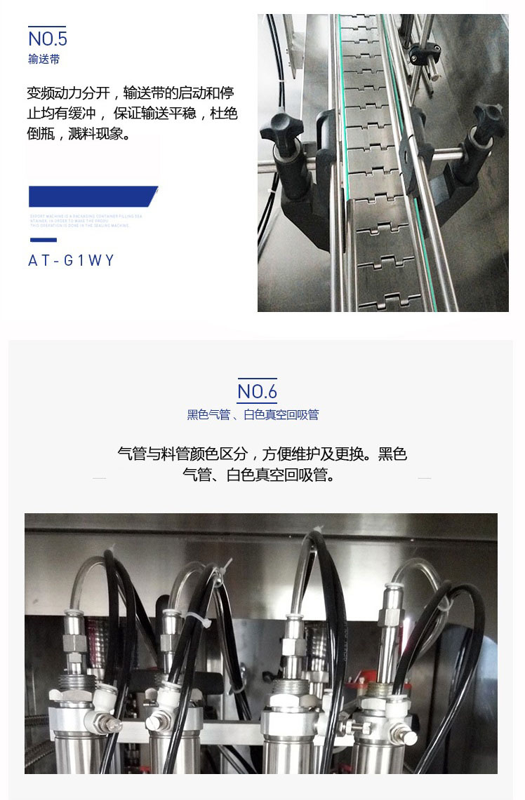 該六頭柱塞式全自動潤滑油灌裝機(jī)特的灌裝頭設(shè)計及真空回吸系統(tǒng),確保灌裝過程無殘油滴漏,快慢雙速灌裝,灌裝速度可調(diào),杜絕溢瓶現(xiàn)象。該機(jī)采用動力灌裝,無需配裝高位罐,簡化了安裝工序,提高了灌裝效率。履帶式壓蓋機(jī),穩(wěn)定無噪音,無空壓現(xiàn)象。觸摸屏界面友好,操作簡捷,SIEMENS PLC控制系統(tǒng),運(yùn)算速度快,性能穩(wěn)定,品質(zhì)卓越。電、氣件均采用精品元件,確保整機(jī)運(yùn)作穩(wěn)定。