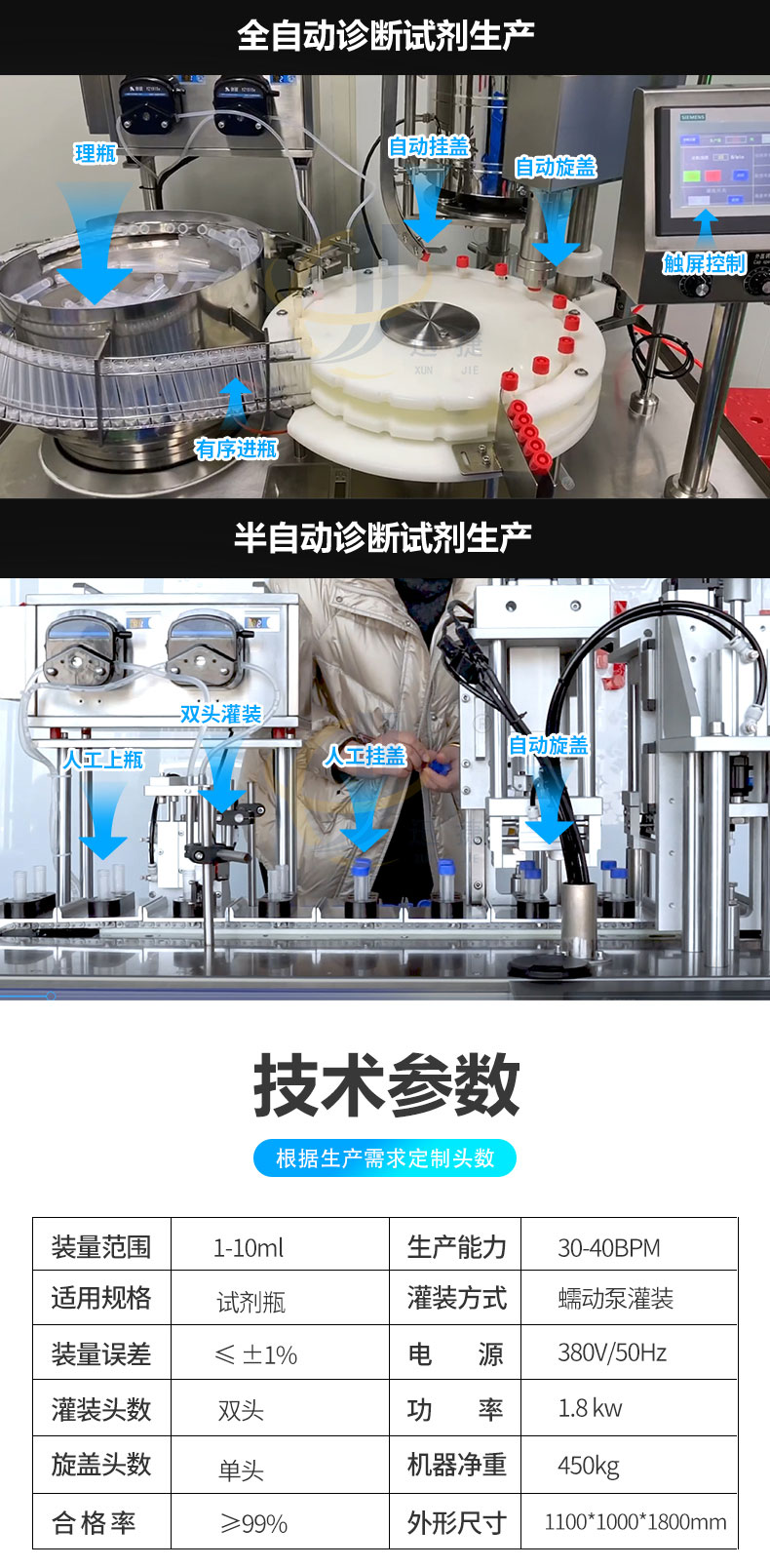 診斷試劑灌裝旋蓋機適用于診斷試劑、液體采樣管等管狀容器。本機可選配防塵罩搭配層流罩(FFU)結(jié)構(gòu),可達到局部百級環(huán)境下完成灌裝及封蓋。