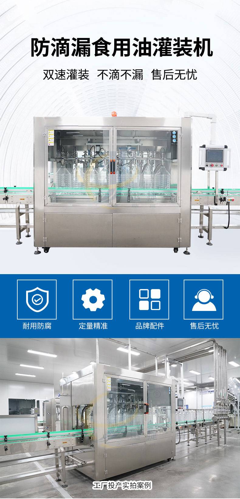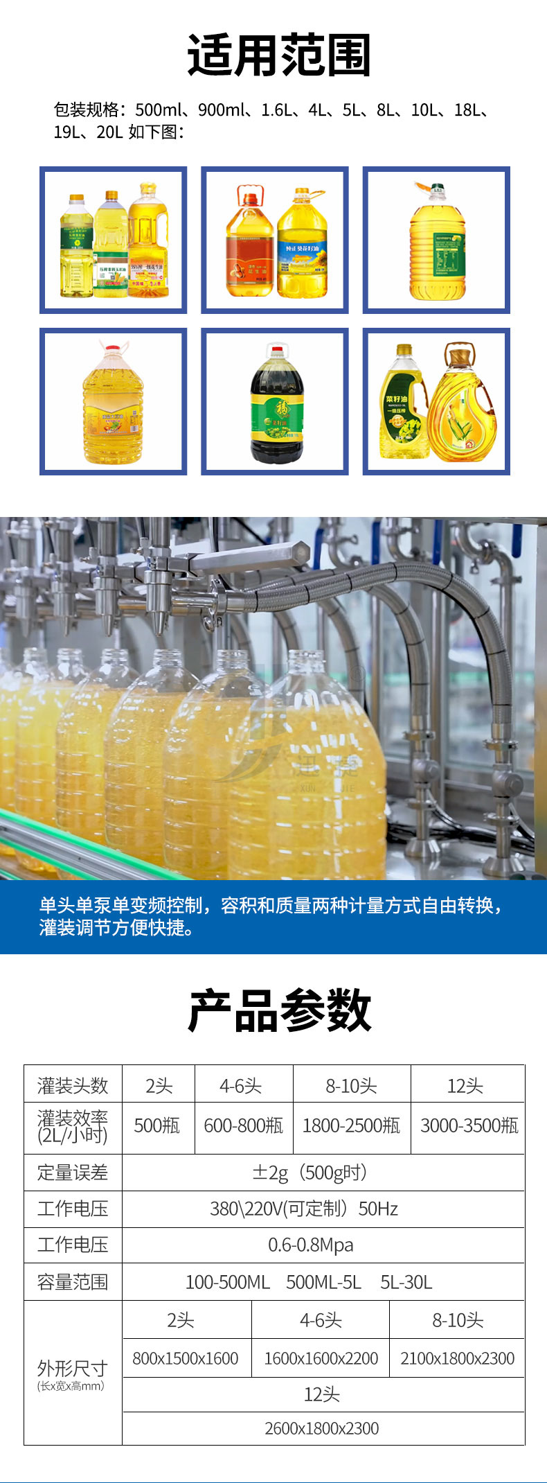 全自動八頭食用油灌裝機單頭單泵單變頻控制,容積和質量兩種計量方式自由轉換,灌裝調節(jié)方便快捷。
