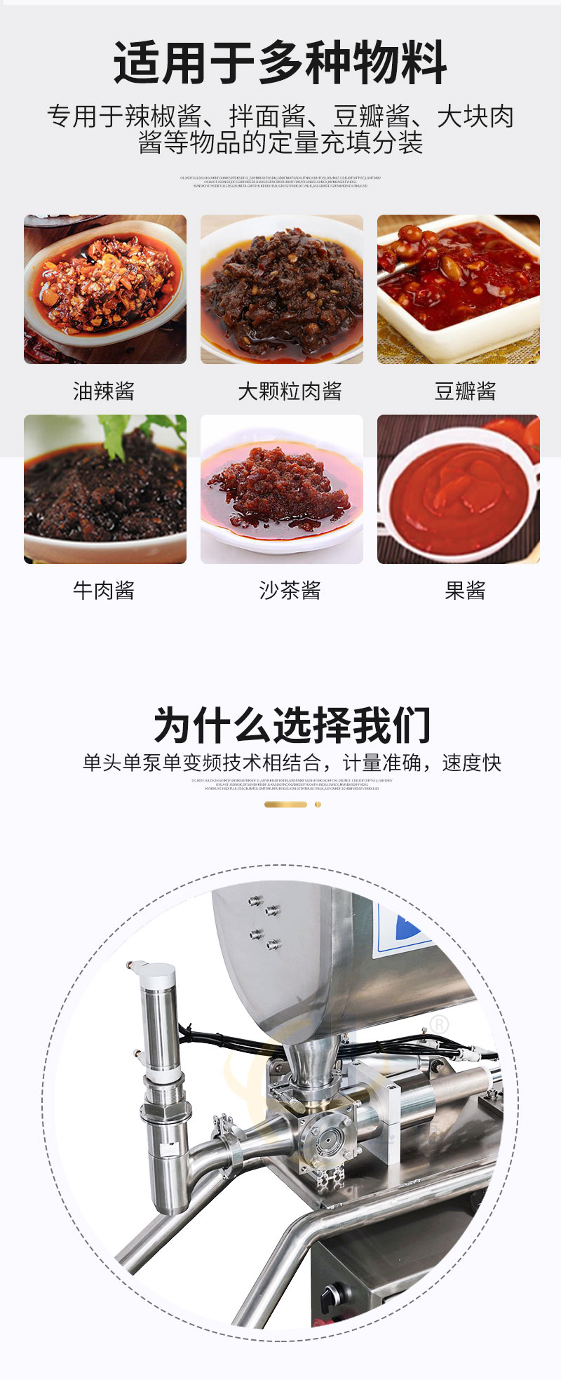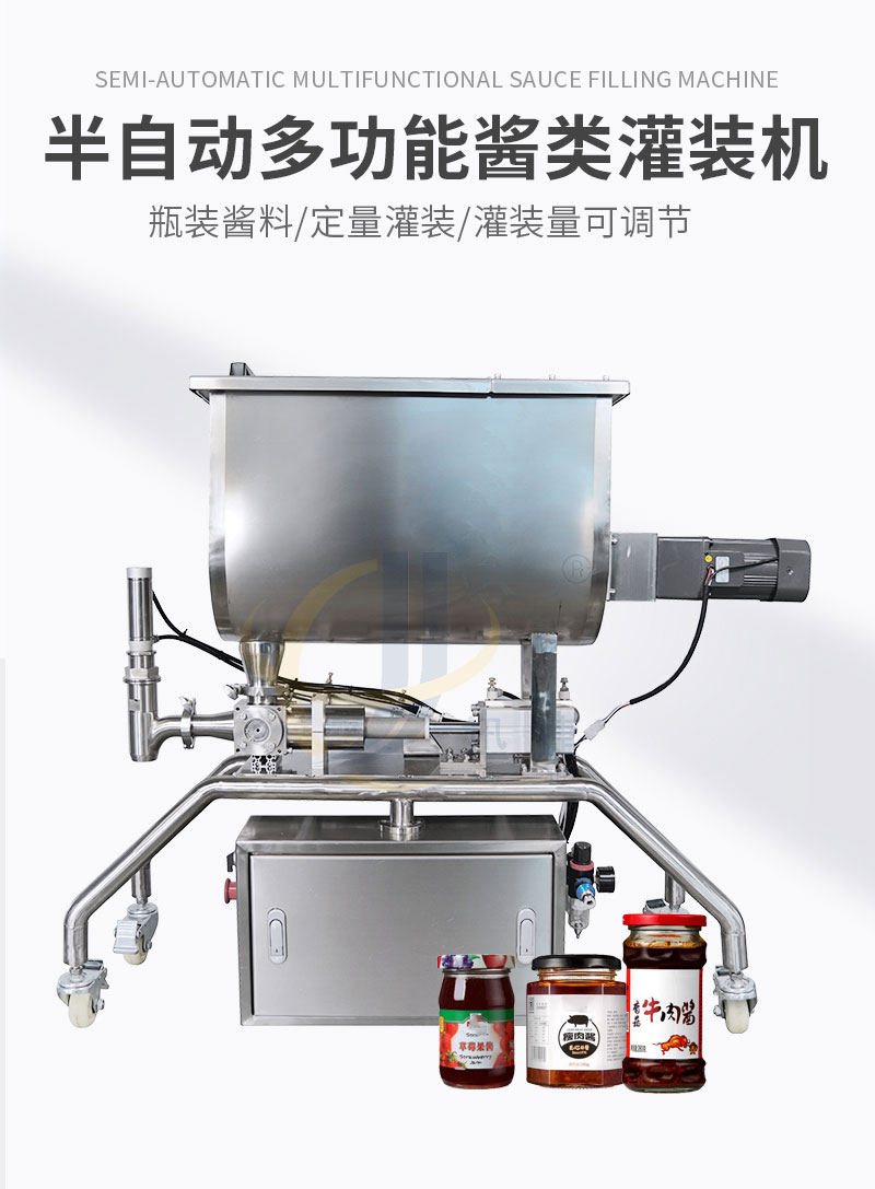 半自動(dòng)醬類(lèi)灌裝機(jī)適合于將各類(lèi)粘稠體及含有各種固體物質(zhì)如辣椒、花生、肉塊、佐料等物體的醬類(lèi)和油、料分離的火鍋底料等灌裝于各種容器中