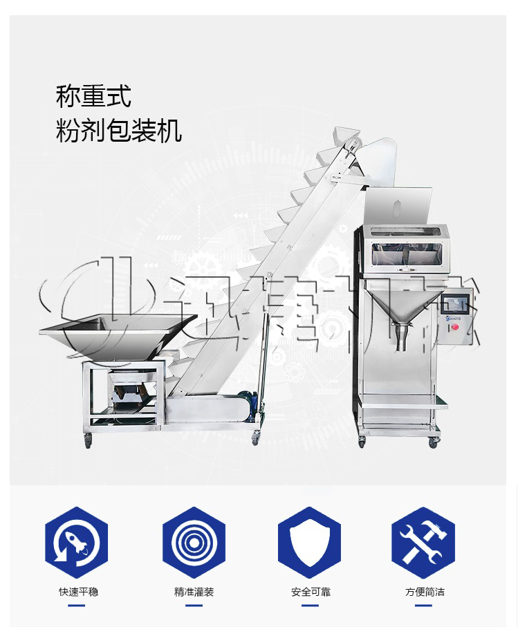 粉劑灌裝包含了上料機、灌裝機和封口機。一般粉劑類的產(chǎn)品,上料一般采用螺旋式上料,第一,能夠確保原料能夠供應(yīng)給灌裝機灌裝;第二,能夠減少揚塵,確保灌裝環(huán)節(jié)的空氣質(zhì)量;第三,采用螺旋是上料,工人在向料斗加料時輕松、方便、快捷,大大提高生產(chǎn)效率;第四,上料機拆裝方便,采用的正反轉(zhuǎn)開關(guān),可將上料機清洗干凈整潔。